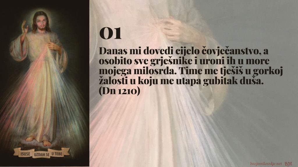 Danas mi dovedi cijelo čovječanstvo, a osobito sve grješnike i uroni ih u more mojega milosrđa. Time me tješiš u gorkoj žalosti u koju me utapa gubitak duša. (Dn 1210)
